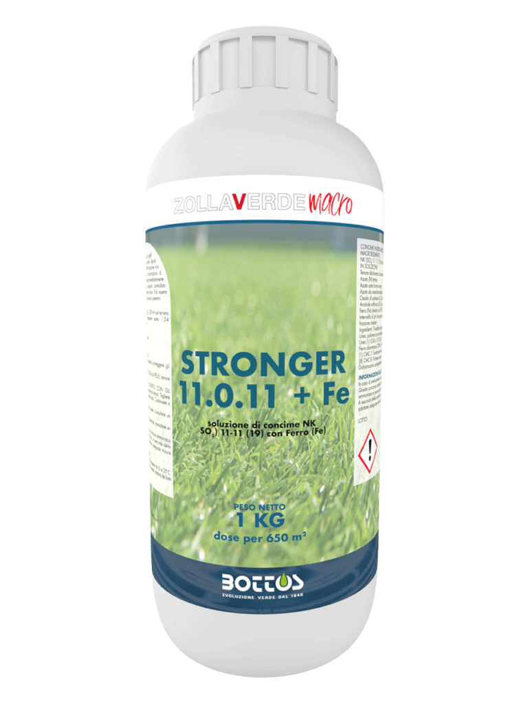 STRONGER 11.0.11+Fe è un fertilizzante liquido di grandissimo spessore con tecnologie all’avanguardia e con risultati strabilianti anche per i manutentori meno esperti. È stato specificatamente studiato per la nutrizione tecnica dei tappeti erbosi costituiti dalle essenze macroterme di ZOLLAVERDE MACRO. STRONGER 11.0.11+Fe si differenzia da ogni altro formulato liquido presente in commercio per la presenza combinata di Azoto a pronto effetto, sotto forma ureica, e di Azoto a lenta cessione, sotto forma di metilenurea. Grazie a questa speciale combinazione STRONGER 11.0.11+Fe assicura una perfetta densità in ogni periodo di attività vegetativa del prato, oltretutto per un periodo di tempo di gran lunga superiore a qualsiasi altro formulato liquido. La sua azione di spinta risulta equilibrata tra la parte aerea, che necessita di aiuti per agevolare la funzione fotosintetica delle foglie, e la parte radicale, che deve esplorare la maggior quantità di terreno possibile per ottimizzare l’assorbimento dei sali minerali.
